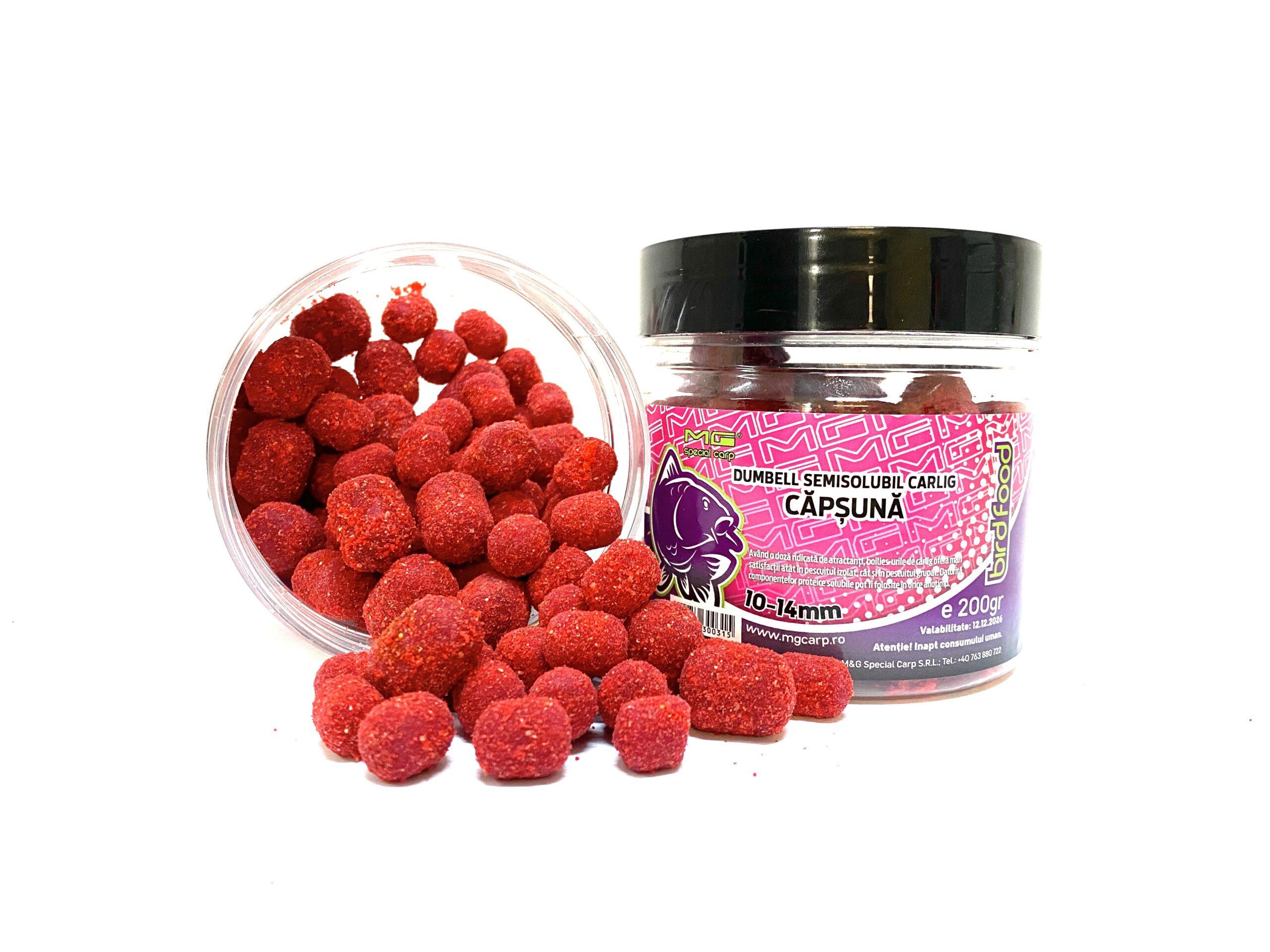 Boilies-urile Dumbell Semisolubile de Cârlig oferă mari satisfacții atât în pescuitul izolat, cât și în pescuitul grupat. Realizate dintr-un mix de făinuri cerealiere de calitate superioară, acestea au o aromă intensă ce poate fi ușor detectată de crapi și o valoare nutritivă foarte ridicată, fiind echilibrate proteic. Partea lichidă din care sunt realizate boilies-urile conține ou și componente de înaltă calitate, fiind bogată în aminoacizi esențiali și stimulatori de hrănire. Aceste boiliesuri au oferit un randament excelent atât în Delta Dunării, cât și pe lacuri sălbatice, indiferent de anotimp, datorită ingredientelor de calitate superioară din care sunt realizate.